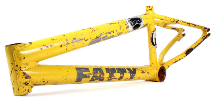 | 1992 | FATTY FRAME. easternbikes.com, march 2013: Eastern Bikes may have started in 1996 but the idea was sparked sometime in 1992 when Mike Corley had problems with the frame we was running and the company wouldnt warranty it. He was taking welding classes at the time and decided to take measures in to his own hands and build a frame he could trust. Mike didnt actually do the welding but knew enough to cut the tubes and get the pieces ready to weld. The rear triangle was cut from a Schwinn. The front-end was made of chromoly bought locally. The dropouts were cut with a grinder Mike had in the garage, hey he didnt have any real tools then. The tubes were welded by a friend of Mikes. The welds weren't pretty, but it was never meant to sell these frames. Random fact: The welder now resides in jail. The Fatty decals were die-cut down by a local sticker maker, Harwood Designs who are still in business today. And the owner was attacked by a knife. Another friend of Mikes was restoring and old Vette and he used some extra paint to give it a 74 corvette yellow paint job. There were a total of four frames made and were ridden by Mike Corley, Jon Byers, Mike Mancuso and one other person who we just cant remember. Jon and Mike for them for two years with out a single problem and no one broke one. A few years later Mike and Jon started Eastern Bikes and the rest is history. In fact Jon recalls; The thought of starting a bike company was never really the purpose it was just to build a few frames, but the experience spawned the thoughts of a bike company that wouldnt leave us alone for the next few years. |