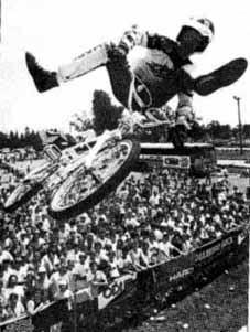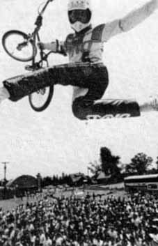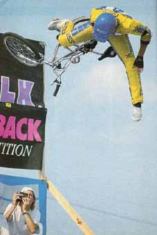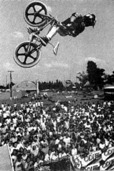 | Date: may 30, 1987. Place: Flint Michigan, USA. Super BMX september 1987: Yup, this one was definitely Ron Wilkerson's best contest to date, and the 2-Hip King of Vert series is gathering momentum with every event. A few examples of why? Here ya go: There was something in the neighborhood of 1500 screaming, and at $5 each, paying, spectators. The venue was cool for an event like this. Playland is an arcade/miniature golf/go-cart/bumper boat/pizza parlor/snack bar thing, and the creature comforts and non-contest diversions added to the carnival-like atmosphere And yes, there were far more good looking ladies congregated here than at previous events .and the riders liked that. There were radio commercials on local stations before the event, urging action-hungry locals to come out and watch the pros in action on "The Undertaker" There was more amateur rider participation than in the past contests, with a still meager 19 riders, but the talent level makes up for the small numbers. On the ramp: With 19 amateurs vying for only eight spots in the final jam, the standard format of two one-minute qualifying runs was used to narrow the field down to the required size. Afterward, the order of the qualifies went like this: 1. Dave Voelker, 2. Gabriel Marroquin, 3. Chris Potts, 4. Bob Kohl, 5. Steve Broderson, 6. Dale Matson, 7. Krt Schmidt, 8. Marty Schlesinger. The first two riders outside the amateur cut were Florida's Mike Gibbons, who totally raged during practice, but saved a bit too many of his tricks for the finals and the Candy Man, Brian Dahl. Brian's no-footed candy bar airs have to be seen to be believed. Still, he was left watching during the finals. Am jam: A straight 20-minute session of pure radness. Dave Voelker, who's not normally known for his halfpipe radness, backed up his number one qualifier standing with a firstplace finish. Full use of the ramp, an outstanding bag of tricks to draw from and good showmanship tipped the judges favor in his direction. Of course, the crowd's favorite tricks were his no-handers, and his ever-famous bike-grabbing flyout. Do we remember 540s at very respectable heights? Yes, could be. Bob Kohl moved up from his number four qualifier spot to second in the final jam. One of the more notable highlights from his routine were his Superman airs a no-footed/one-handed rocket air. Intense. You will hear more about this guy in the future .we guarantee it. A couple months back in our sister publication, Freestyle, we introduced you to Awesome Shoes factory rider, Chris Potts. Many of you may not have heard of him. You will in the future. He rips. The biggest beef award, unfortunately, goes to Steve Broderson. He looped out after an air, and rebroke his recently healed left foot. Fortunately, besides Steve's incident, the contest was relatively injury-free. Now, moving to the pros... So far, at every contest he's held, Ron Wilkerson has gotten a third. This time, he tied with Mike Dominguez. Highlight of Ron's jam included a first-air hang that dinged his rear mag wheel and left him without the use of his rear calipers for the rest of the jam. Then there was the one hander/half-footer (which he made), and a later attempt at a nohander/no-footer (all at the same time), which he bailed on. Michael Dominguez was pulling off his usual high airs, and adding things like no-handers to his bag of tricks, and late in the game he even went for a much-talked-about and seldom-seen 900, but unfortunately at about the 820 mark it ran out of steam and a bail resulted. Brian Blyther pulled off his usual endless stream of high and extremely smooth airs, and his 540s were unleashed at above average altitudes, but it wasn't enough to beat Josh White's onslaught of massively bio moves. Killer no-footed fakies, one-handed/no-footed cancaner and cancan lookbacks are just a few of the mind-numbing moves that spectators and judges saw. Was Josh stoked with his first pro win? Are you kidding? If he keeps riding like this through the rest of the year there will definitely be more contest wins added to his list of accomplishments. Adios. After the judges reviewed the tapes and tabulated their resuits, the awards were handed out and not a minute too soon. One of the local thunderstomns unleased itself on the contest site, quickly scattering both competitors and spectators. Now for the really good news. if You live in the area of Flint, Michigan and want to try out this pay-for-play ramp, GO FOR IT! It'll be open all summer, under the watchful eye of Greg Flowers, the builder and operator. Lew, Freestylin october 1987: It's been a good three weeks since the Flint, Michigan Playland jam, round two of the 2-Hip King of Vert. I figure it's about time I wrote the story, so here goes. Sitting on my right I have the World Famous Spike J. Jonze, who happens to be here for the sole purpose of helping me out in this literary adventure. For those of you who aren't aware of it, Spike is our new assistant editorial lofter of jive. "So Spike ... how was the contest?" "It was like icing on cake. It was an amazing feat I wasn't there." "Then what are you doing trying to help me write the story. Go finish up the Plywood Hoods article!' "Okay... see ya later." Now that that's taken care of, we can get down to business. Like I was saying, I was in Michigan, which I might also note is my home state. I was psyched. Of course, I was hard at work the whole time... especially the night before the contest in downtown Flint with Greg Flowers and the Reflex crew. By the way, just so it gets mentioned somewhere in the story; let it be known that the whole Flint jam wouldn't have been possible if it weren't for Gary and all the other extremely cool people at Grand Blanc Cyclery along with Greg Flowers, who was responsible for ramp construction. Thanks for supporting the scene, you guys. Speaking of the ramp . ... when you check out the photos, remember that the top of the banners was marked at a little over ten fe