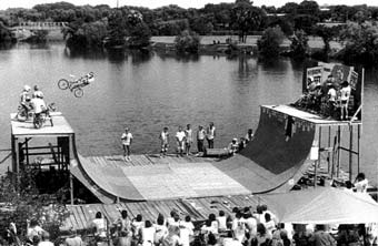 BMX Plus! november 1988: It was a hot and humid day on Austin's Colorado River. Promoter Ron Wilkerson added an unusual twist to the contest by renting a barge for the contest and built the halfpipe on the barge. It was a novel location, but it did present some problems. the barge rocked every time the riders pumped for an air and every time they landed. Brian Blyther and Matt Hoffman were still able to push themselves up close the ten-foot level.