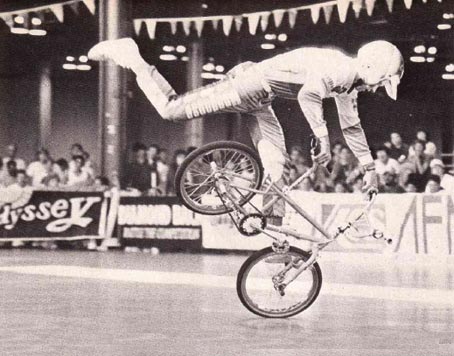 | Mat Hoffman, The Ride of my Life, 2002: My favorite part about the contest scene was the feeling of being immersed in bike riding, bonding with my friends one epic weekend at a time. Contests were about seeing the new tricks, kicking a little ass on the ramp, heckling my teammates, and at the end of the day, getting goofy at the Dennys dinner tables. All that began to change midway through 1987, at an AFA event in Columbus, Ohio. It was the biggest AFA contest to date, about 260 riders strong. Eddie Roman and I were amusing ourselves (and no one else) using a homebrewed geographic joke: With a cheerful expression, we'd approach other riders and exclaim, "Oh. Hi! Oh... The sport was booming, and the influx of new riders meant the manufacturers were pumping a lot of cash into freestyle bikes, tours, and teams. Each month the number of kids seemed to multiply and companies added to the sport, defining it with a contagious energy. T-shirts and 'zines were being created, forming the bike subculture that surged up from the underground. At the Ohio comp, it was evident how popular riding had become in a short time. There were thousands of spectators, and hundreds of bikers who swarmed like lemmings to the contest -some didn't even compete, they just came to ride. Ohio was one of the first contests where the extracurricular activities surrounding the competition overshadowed the event itself. Rebellion was in the air. Big parking lot flatland jam circles and allnight street riding were becoming the norm. Despite the best efforts of AFA president Bob Morales and his affiliates around the country, the riders at AFA events wanted more than just a contest. They wanted a scene. A lot of guys had traveled to Ohio on their own, unsupervised by parents, for what seemed like the first time. The host hotel was a Holiday Inn. It was inundated with riders who found power in the pack mentality-sometimes it was five or eight guys, plus bikes, to a room. Mayhem ensued. The telltale signs were all around -skid marks on the carpet, tire scuffs in the elevators, stickers on lampshades. And there was noise, constantly. High-speed, ride-by pillow jousts left the hallways littered with shredded feathers and giggling idiots. Room service trays were sent flying out of hotel room windows, clattering onto the sidewalk below. Patio furniture found its way into the swimming pool, Coke machines toppled over, trashcans were sent tumbling down stairwells, and fire alarms rang at least once a night throughout the weekend. The hotel managers were beyond irate and called in the cavalry. The flicker of red and blue police lights sent riders scattering like roaches-seeking cover in their rooms or taking off for the streets. This was repeated a couple times over the course of the weekend. Most people had arrived at the contest Friday night, and by Sunday morning, rumors were flying about bikers-versus-helicopter street chases with twenty or fifty guys trying to elude the searchlights. Many had been threatened by the hotel management with eviction from their rooms or had been forced out by the chaos. Legend was born when Large Ray, a freestyle cult figure, hatched a fist-sized turd on a napkin, then placed it in the continental breakfast kitchen microwave, set to "high." Ten minutes later, the odor swept through the hotel ventilation system and penetrated the entire building with a suffocating, sulfuric stench. Everybody needs to rebel against something, but that contest was an all-time low. I was satisfied just being annoying with my Oh-Hi-Oh joke. |