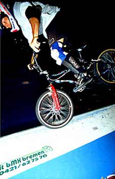 | Spine, ramp to wall, small funbox, ... Slam zine: Some radical tricks stay in my memories: a guy with a black WAL and another one with a black mongoose did some great fakie wall ride, the front wheel at 9 or 10 feet. I also remember: 180 over the spine, nose bump one foot across the spine, 360 fly out of the spine, a guy wich look like Eddie with a blue Anlun with too much stickers on it, a big rear tyre and a sprocket guard. This guy did some killer grinds and good jumps and during the street final played his guitar with very much conviction. Klaus Dyba did it too and played Minor Threat. A guy coming from nowhere, not wearing any knee guard nor helmet, tried 3 times to do backflips on the fun box, but the curve was too small and everybody was stocked. He fell down very hard but happily he's not dead. Street 1.Marc Matter ? 5.Thomas Stellwag |