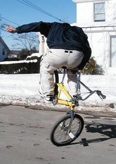 2004 Believe it or not, I'm working on a few original flatland moves. I didn't follow any BMX during the 90's... but kept thinking about it. When I came back and saw what everyone was doing, I realized I still had a lot of originality going for me. I'm working on some of those moves right now. Still need some (some?) conditioning, better weather, and practice, practice, practice -- but it's all very possible and likely to turn some heads if/when I get it down. Of course until I get it down or give up, it's strictly confidential.